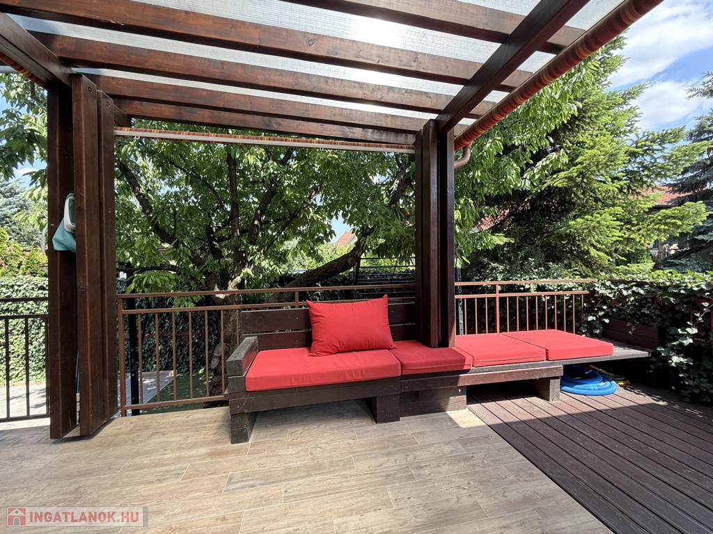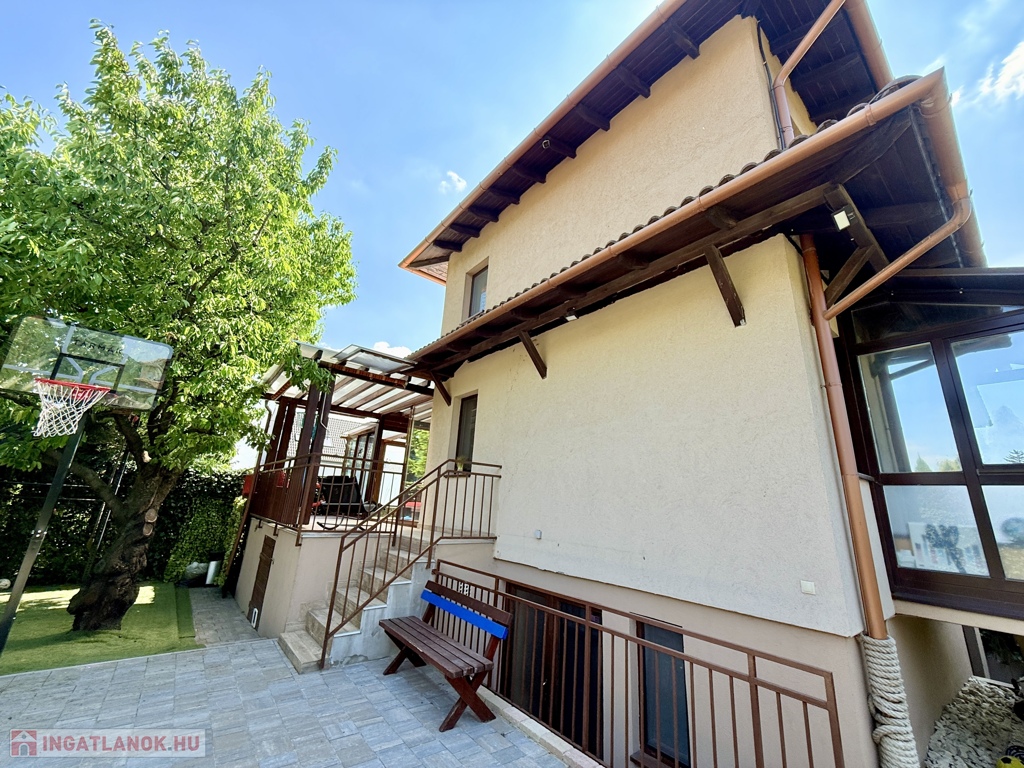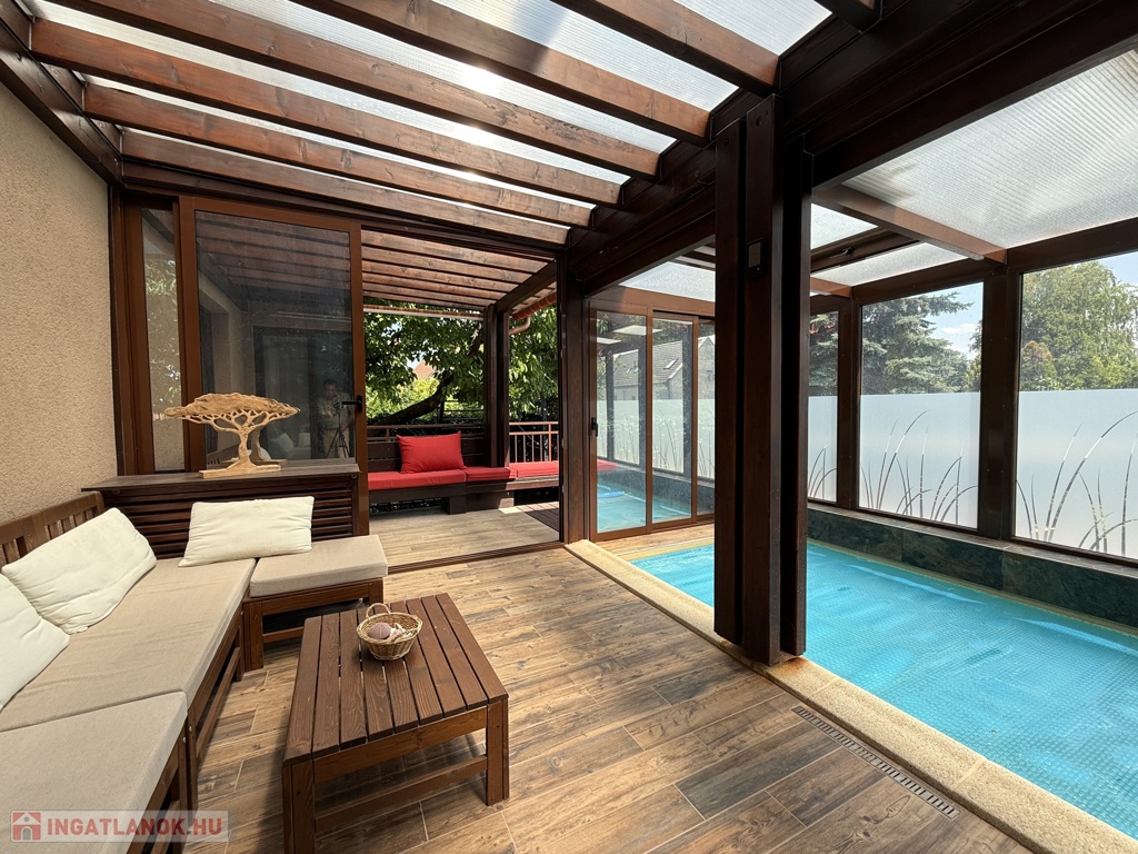 Családbarát, klimatizált, fedett medencés, 4 szobás ikerházfél Budaörs zöldövezetében, a Törökugrató lábánál eladó.