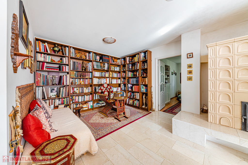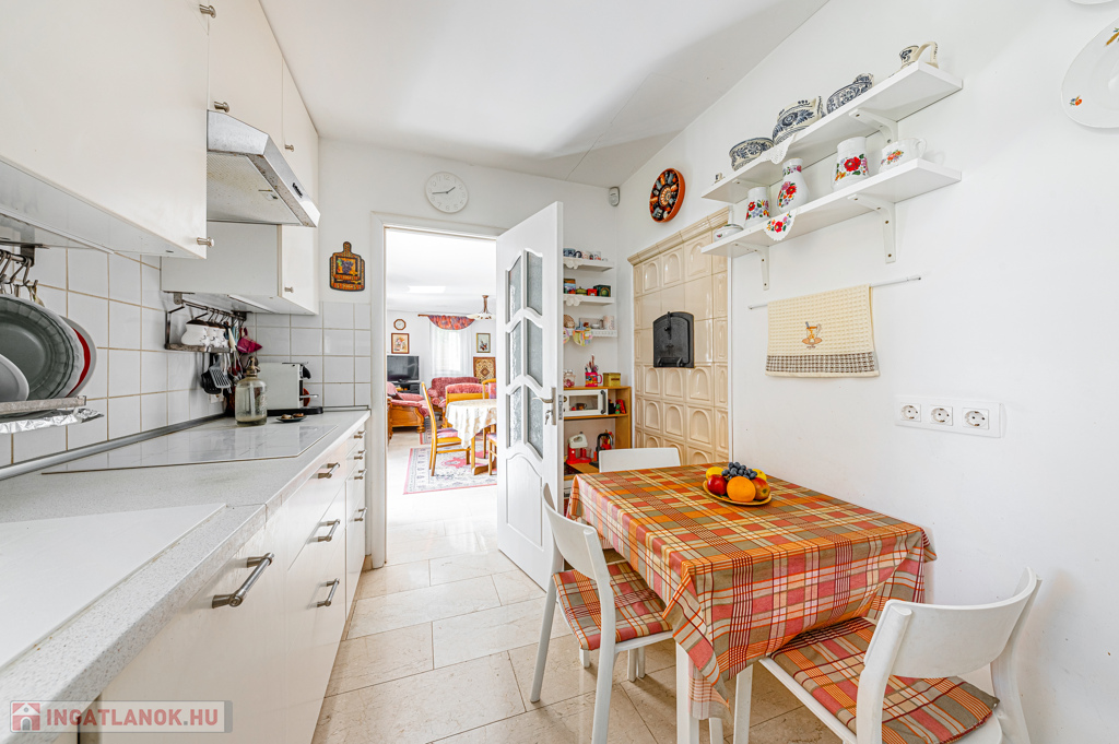 A földszinten tágas, óriási teraszhoz kapcsolódó nappali és étkező-konyha adja a központi életteret, amelyet a három helyiséghez is kapcsolódó, gyönyörű kerámia elemekkel épített cserépkályha tesz különlegessé.