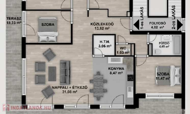 A földszinti lakás beosztása: 40 nm-es amerikai konyhás nappali közvetlen terasz- és kertkapcsolattal; négy külön nyíló, jól bútorozható, kényelmes méretű hálószoba, amelyek közül kettő szintén terasz- és kertkapcsolatos; két, káddal, illetve zuhanyzóval felszerelt fürdőszoba WC-vel; külön vendégmosdó; valamint a konyhából nyíló háztartási helyiség.
